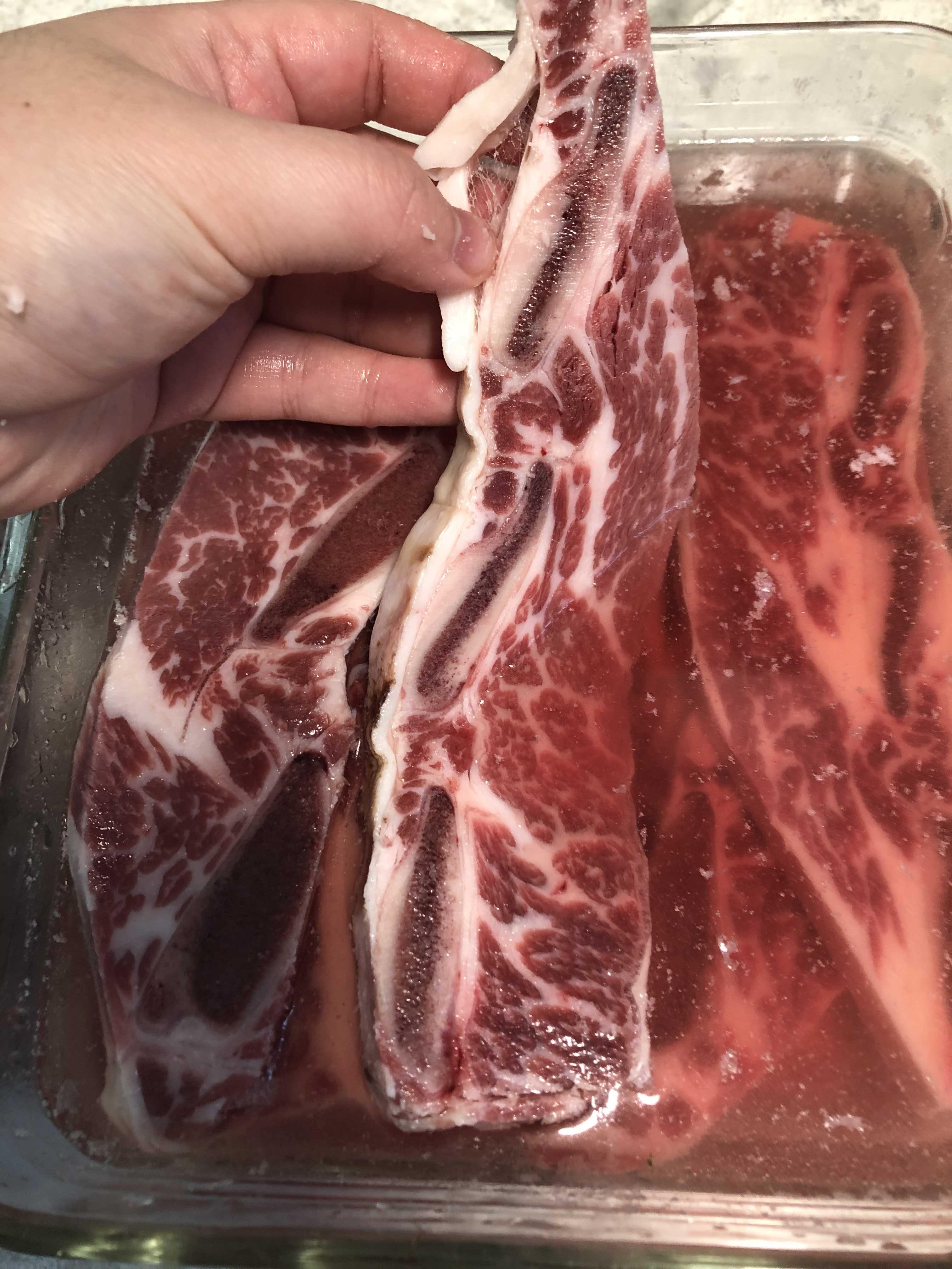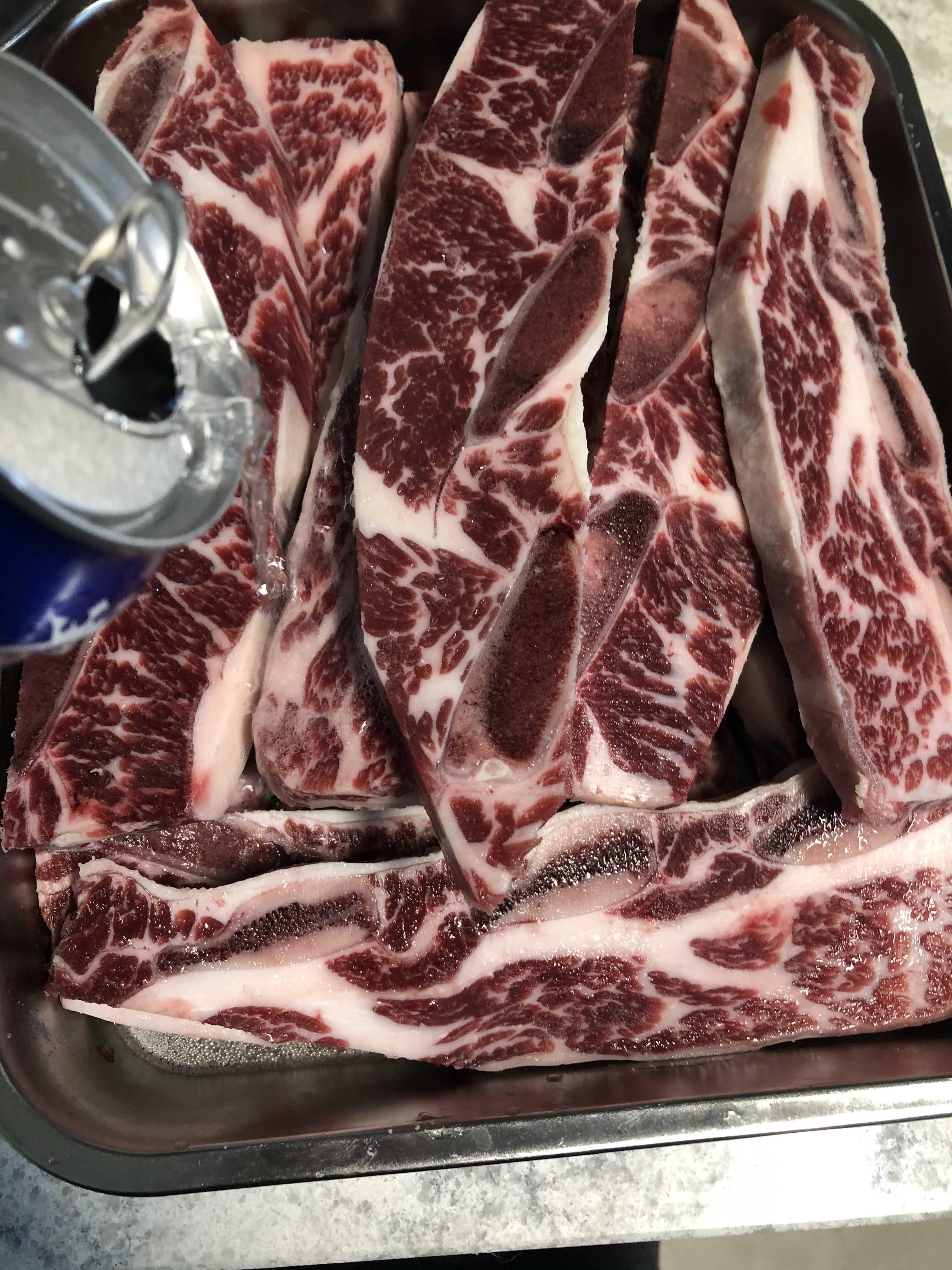 첫번째는 갈비 핏물을 탄산수로 빼는 것이다. 나는 전부 탄산수는 아니고 탄산수에 물을 1:1정도 섞는다. 그래도 핏물이 5분정도 부터 엄청 나오기 시작한다.. 어느정도 핏물이 나오면 살짝 미지근한 물로 갈아주자. 냉동 갈비라서 살짝 따뜻한 물이 핏물이 더 잘 빠진다.
