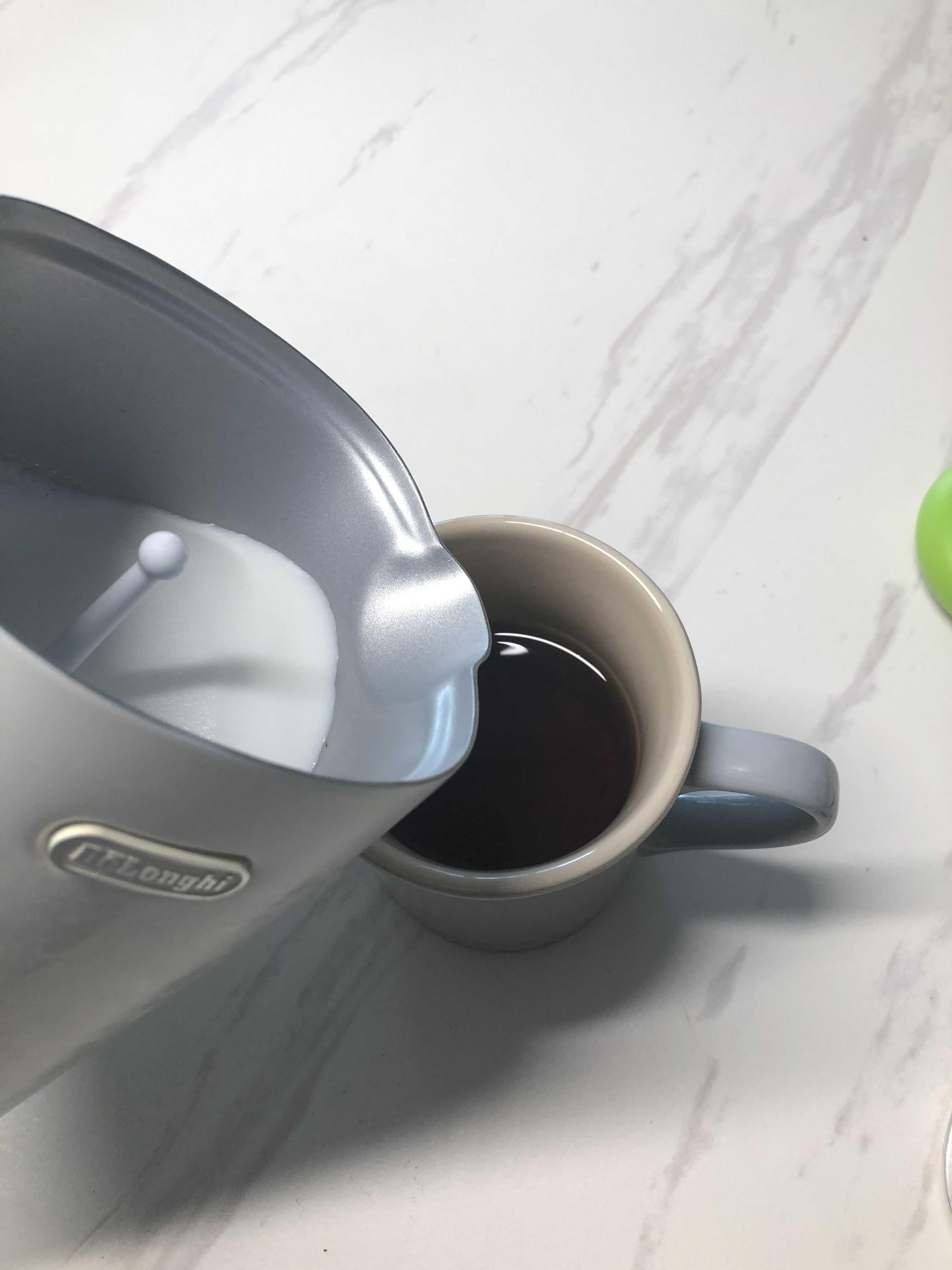 우유를 드롱기 구름치노로 거품이 많이 안 나게 데워서 잔의 1/3 정도 넣었다.