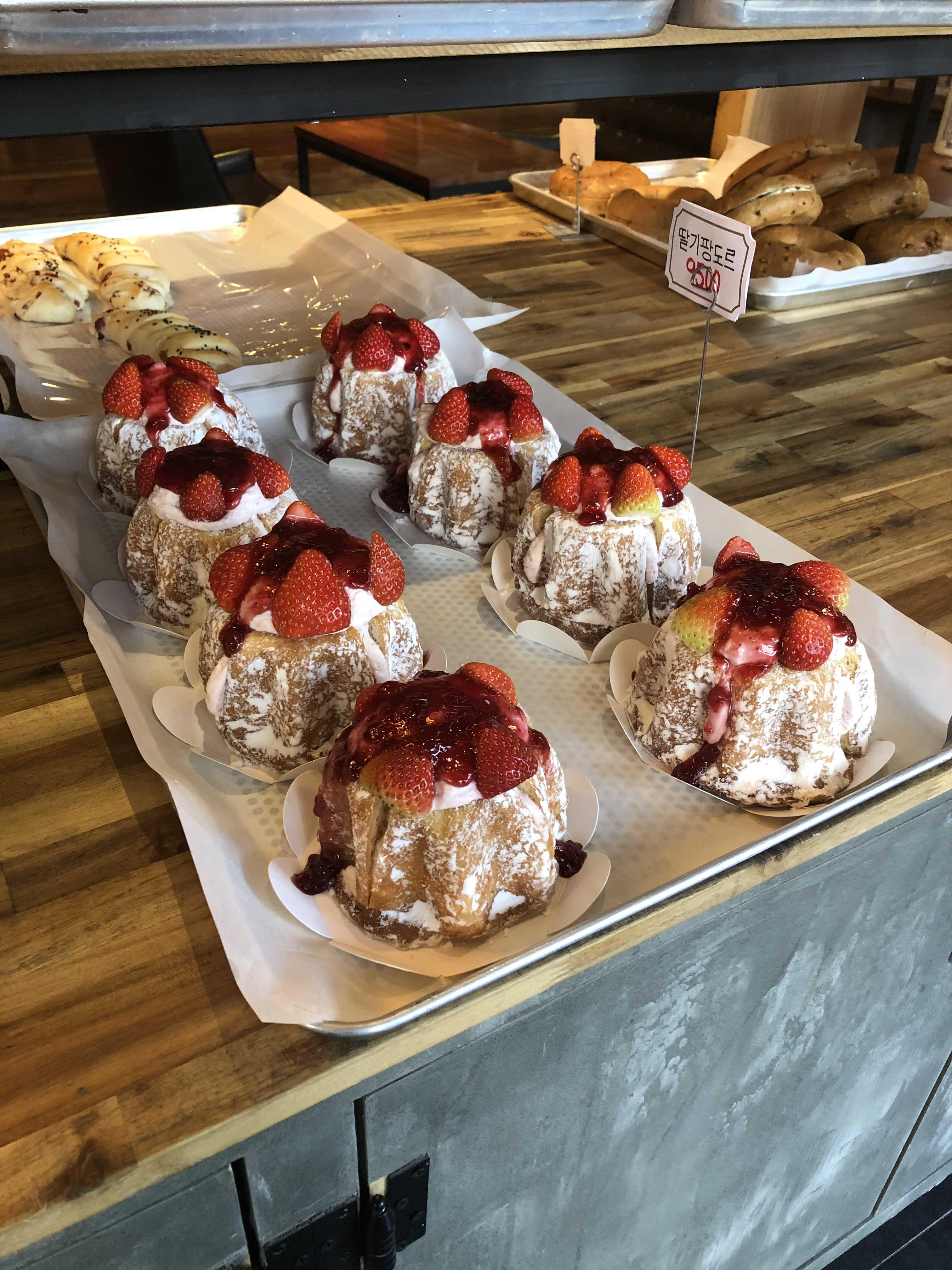 제철을 맞아 딸기로 만든 빵이 많이 보였다. 꽤 먹음직스러워 보였으나 차안에서 나눠먹기 좋은 빵을 고르느라 패스했다. 어른도 먹기 힘들지만 애들이 개칠하며 먹는걸 상상하니 무서웠다.. 딸기 타르트도 있었는데 품절이어서 어떻게 생겼는지 볼 수 조차 없었다.