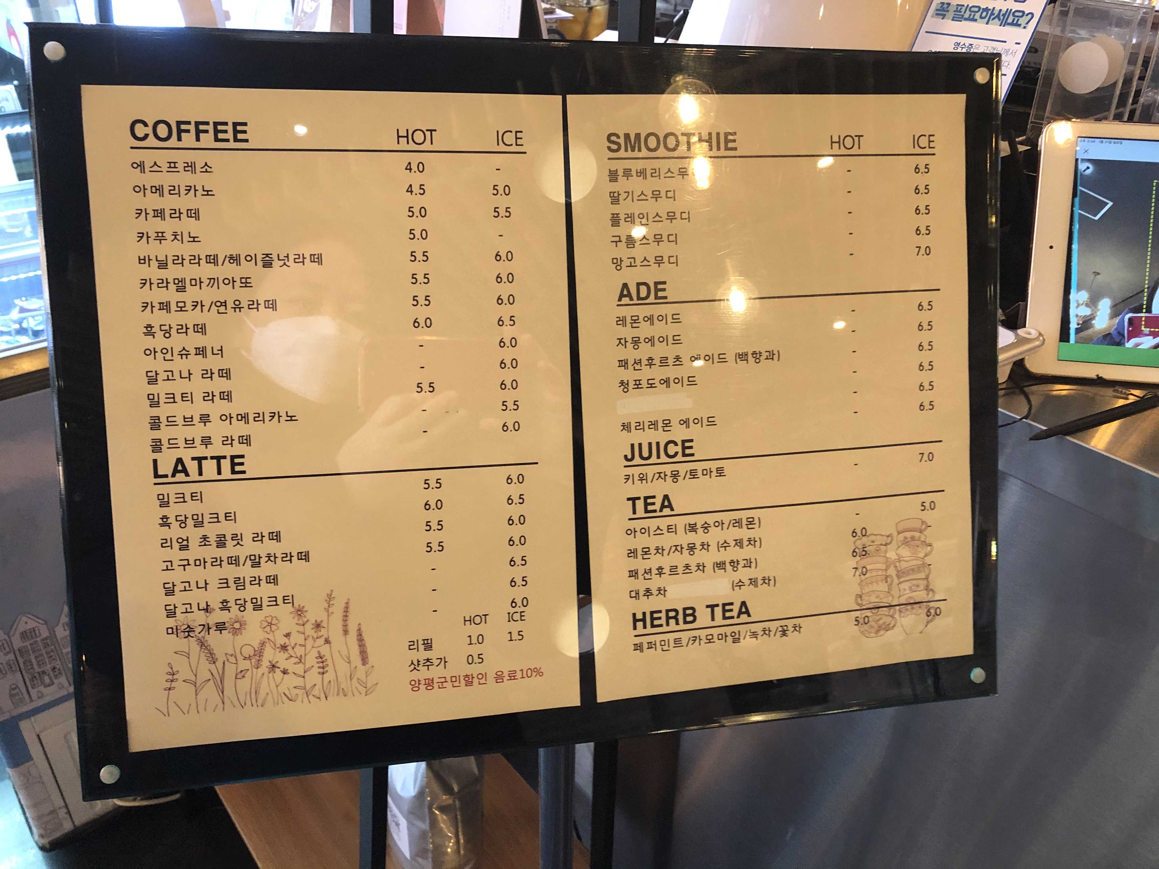 유기농빵이라고 하던데 그래서 빵이 생각보다 가격대가 있다. 빵이 꽤 크지만 5000원 미만 되는 빵도 거의 찾기 힘들었다. 음료 가격은 보통의 베이커리 카페 수준인 것 같다. 자세한 내용은 아래의 사진 메뉴판을 참고하면 되겠다.