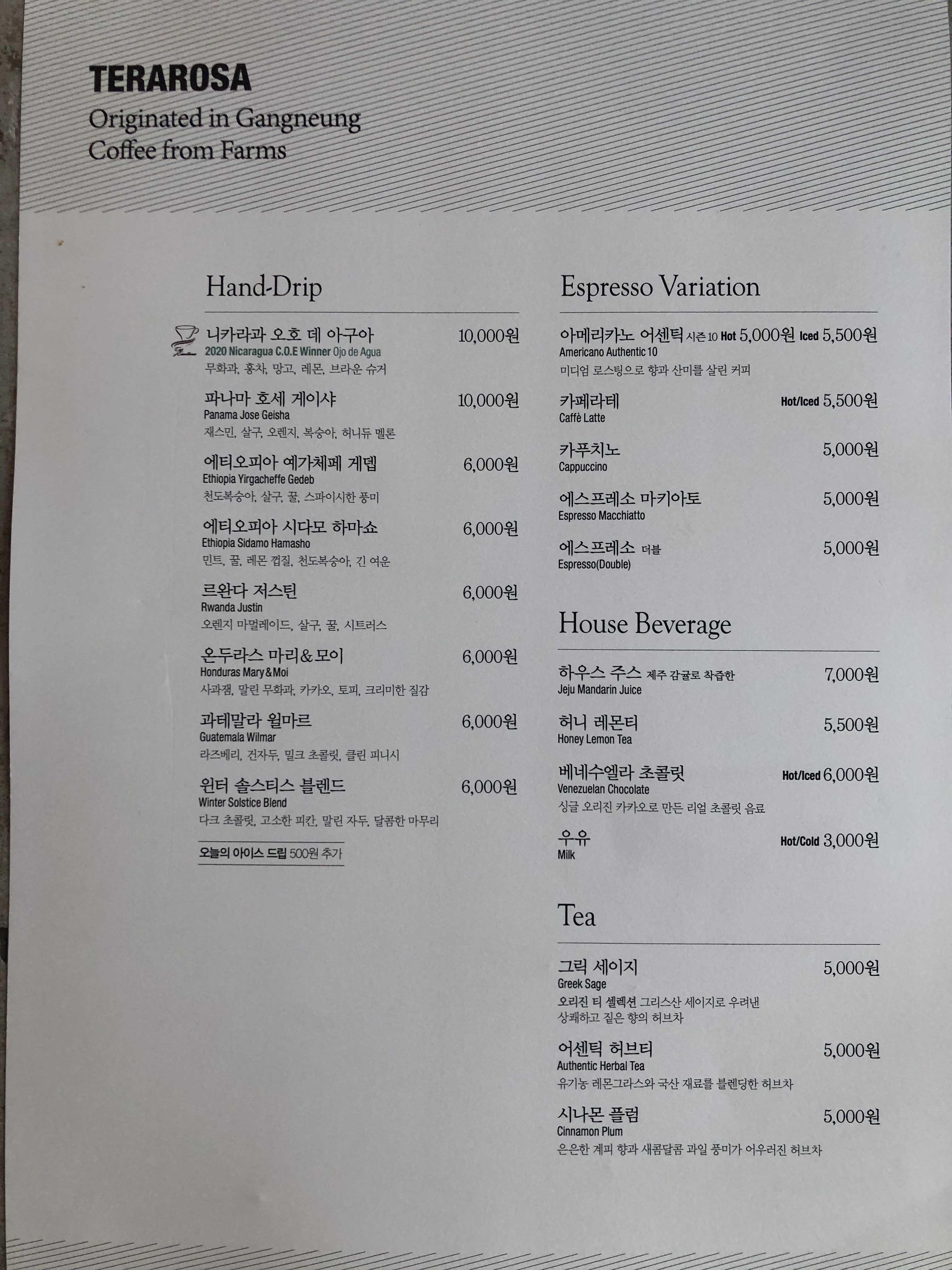 확실히 커피 전문점이라 그런지 테라로사 커피에는 다양한 종류의 핸드드립 커피 메뉴가 있다. 가격대가 있지만 핫초코를 먹어보니 왜 가격대가 살짝 비싼지 이해가 되었다. 다음에는 핸드드립 커피를 마시러 꼭 재방문을 해보고 싶다.