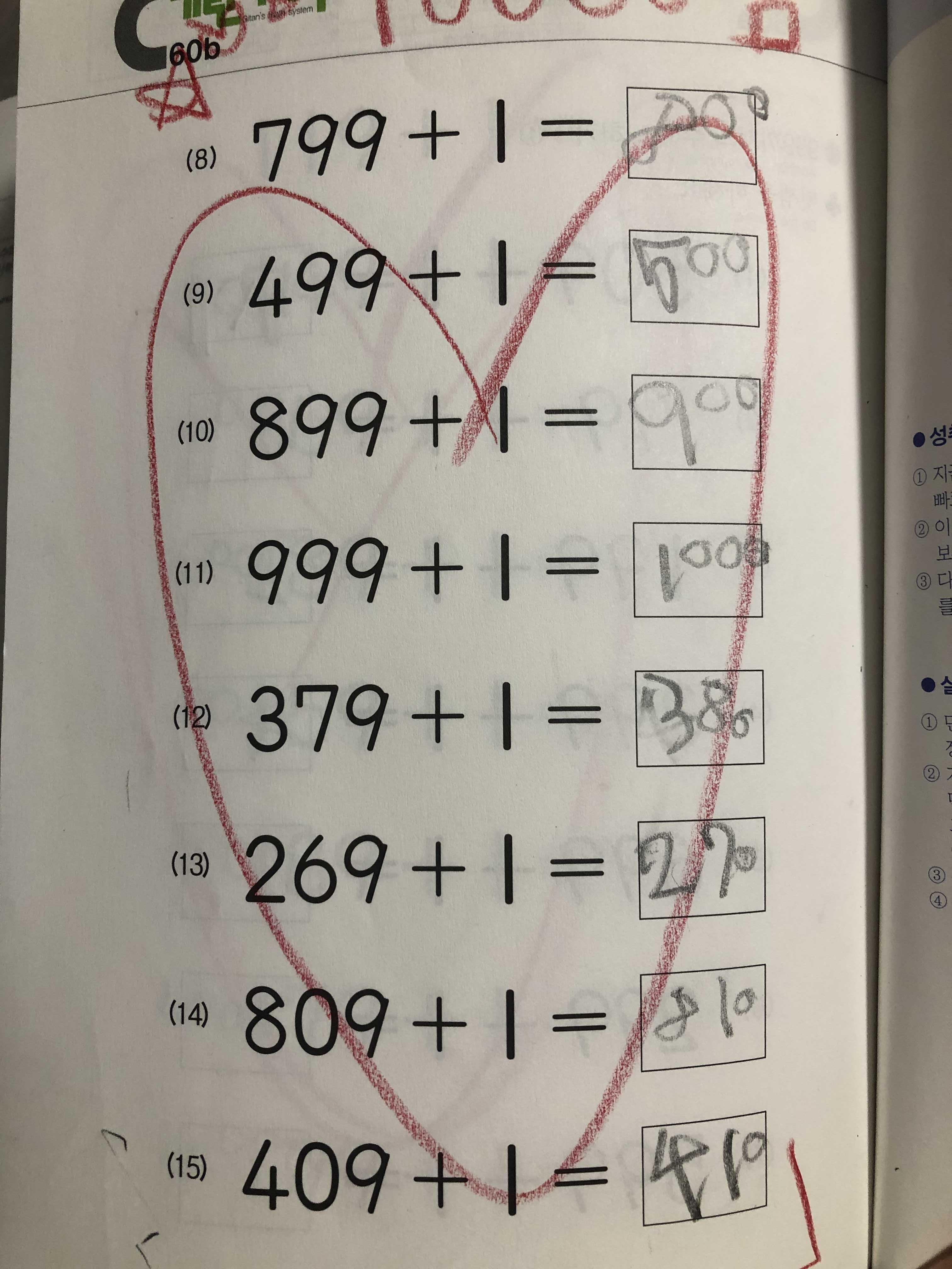 기탄수학 C-1의 끝 문제는 아이들 입장에서는 어마무시하게 큰 수가 나오는데 뭔가 큰 수 덧셈을 해냈다는 (고작 +1이지만) 커다란 자기 효능감을 이끌어낼 수 있다. 그와 동시에 +1의 개념을 큰 수가 나와도 쫄지 않고 정확히 풀어내는지 확인하는 것이 포인트일 것 같다.
