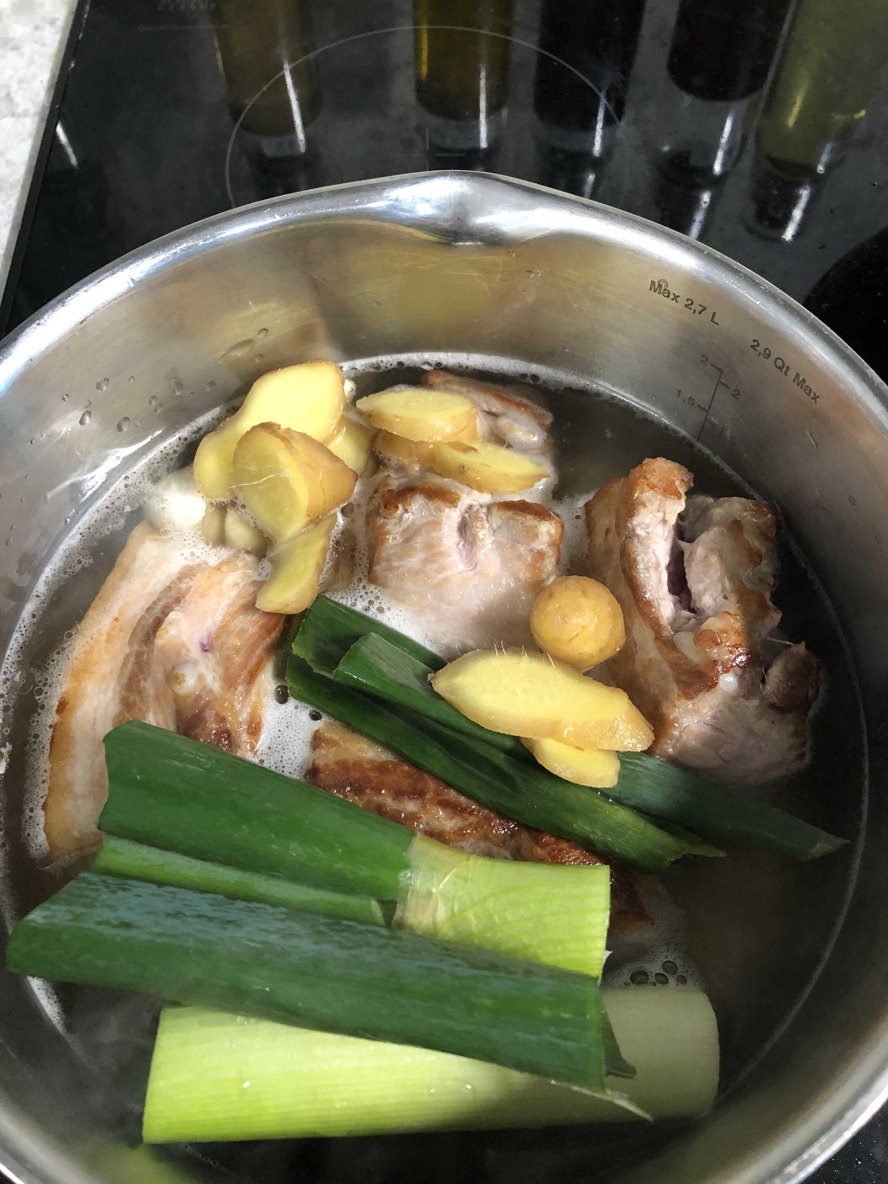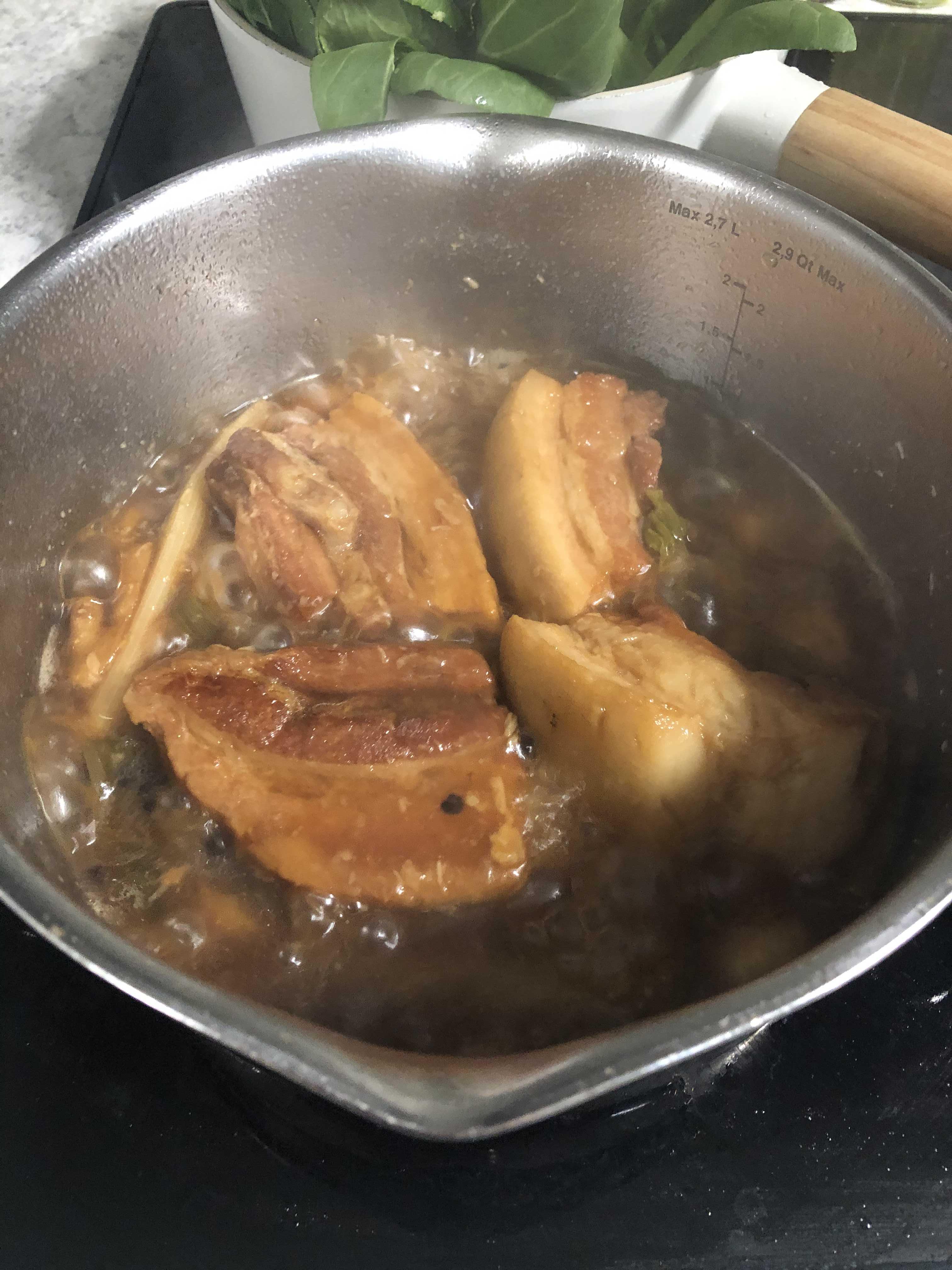 구운 삼겹살 조각에 폭 잠기게 물을 충분히 넣고 향신채소를 넣고 푹 삶아준다. 센 불에서 끓여 물이 끓기 시작하면 중 약불로 불을 줄여준다. 최소 한 시간 이상은 삶는 게 좋고 여유가 있으면 시간을 더 들여 삶자. 오래 삶을 수록 맛있다.