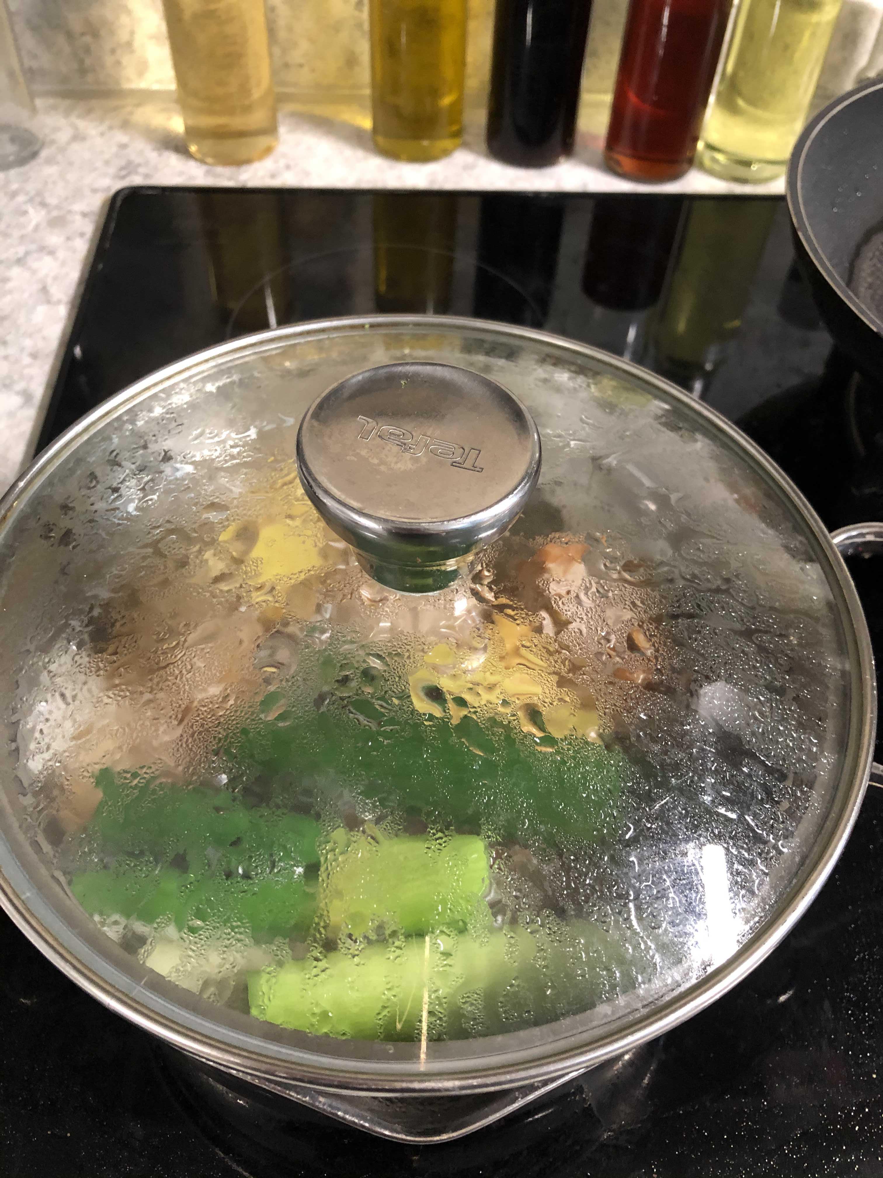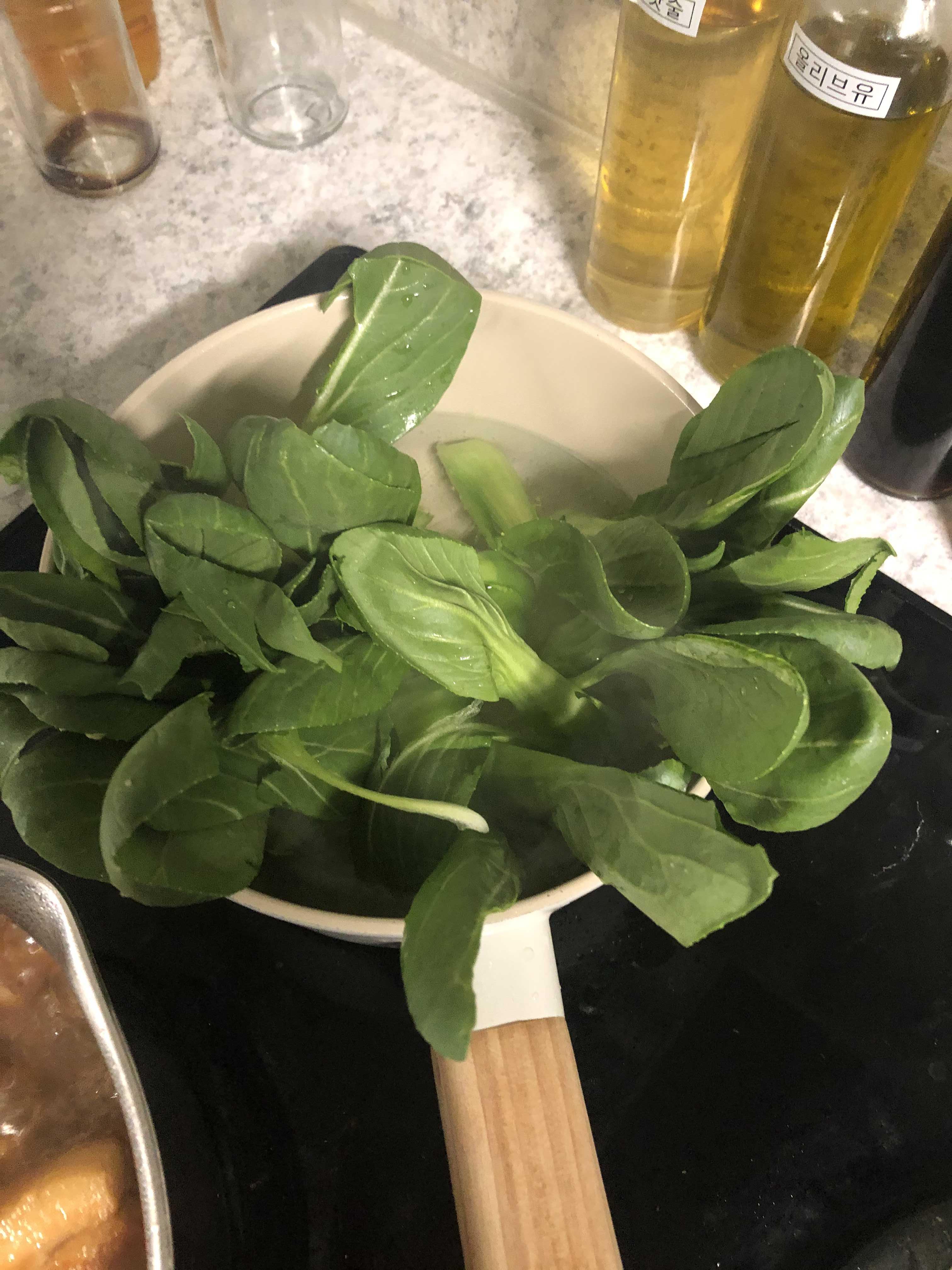 삼겹살을 조리는 사이에 청경채를 끓는 물에 데쳐준다. 예전에 요리왕 비룡 만화책에 보면 청경채를 삶을 때 기름을 약간 넣고 그 기름막에 청경채 머리부터 넣어 코팅하듯이 데치면 맛있다고 했는데 나는 그냥 데치는 게 훨씬 나았다. 특히 동파육은 고기 차제가 기름져서 더더욱.. 역시 만화는 만화일 뿐이다. 특히 요리왕 비룡이라면 말이다.