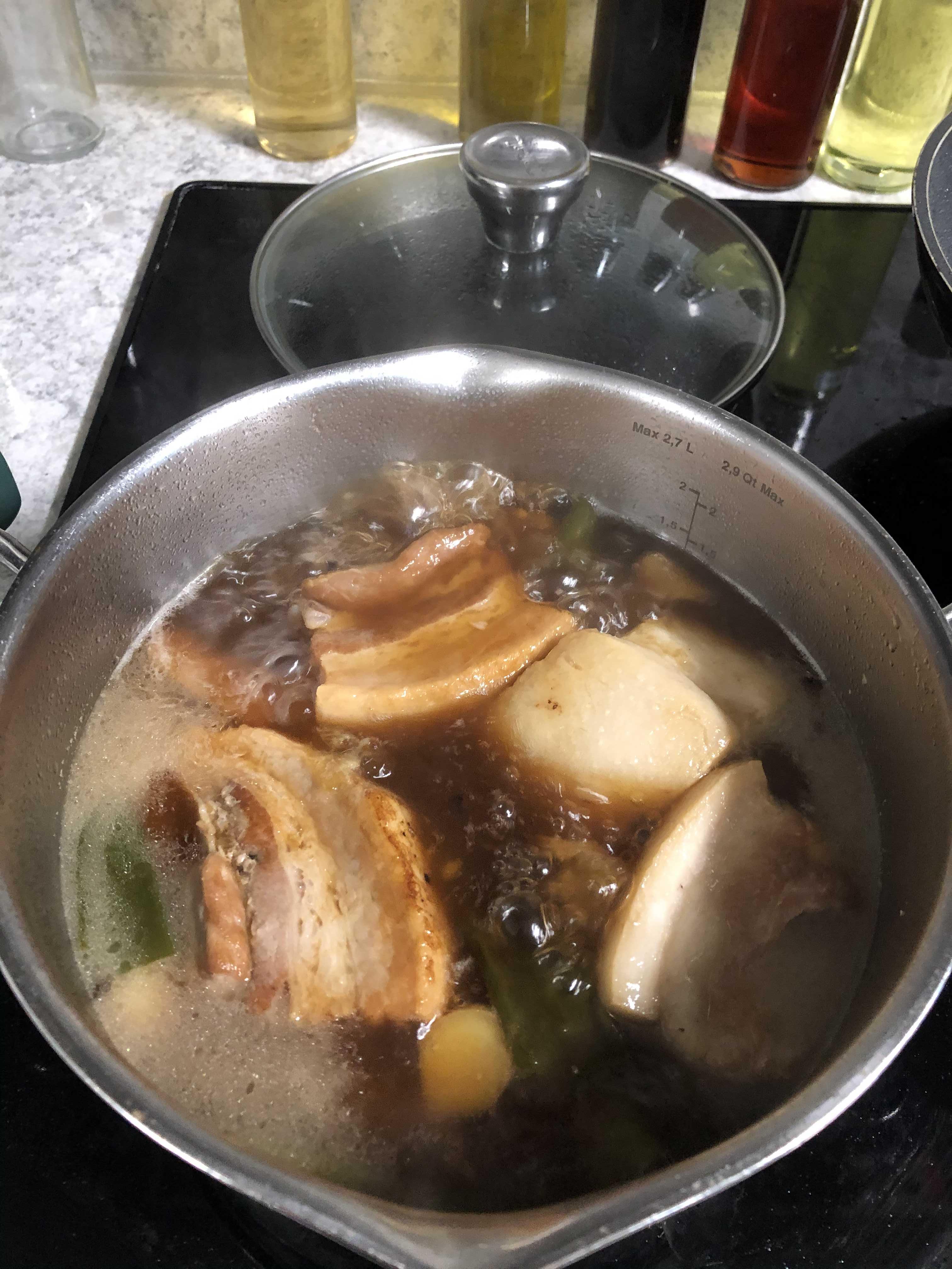 고기가 적당히 삶아졌으면 그 냄비째 그대로 간장과 설탕을 넣고 뚜껑을 열고 간장, 설탕, 맛술과 후추, 팔각을 넣고 양념장이 반 이하로 줄어들 때까지 센 불로 조린다. 팔각은 향신료나 허브를 좋아하는 나도 가지고 있지 않은 향신료이다. 아무리 생각해도 동파육 정도밖에 넣을 곳이 없어서 사지 않았다. 아마 대부분의 가정에 팔각은 없을 것이라고 생각한다. 팔각이 없어도 맛있게 먹을 수 있지만 사실 오리지널 동파육보다는 일본 라면 고명으로 올라가는 차슈에 가까운 맛인 것 같기도 하다. 팔각이나 노주까지 있다면 중국집과 거의 비슷한 맛이 날 것이다.
