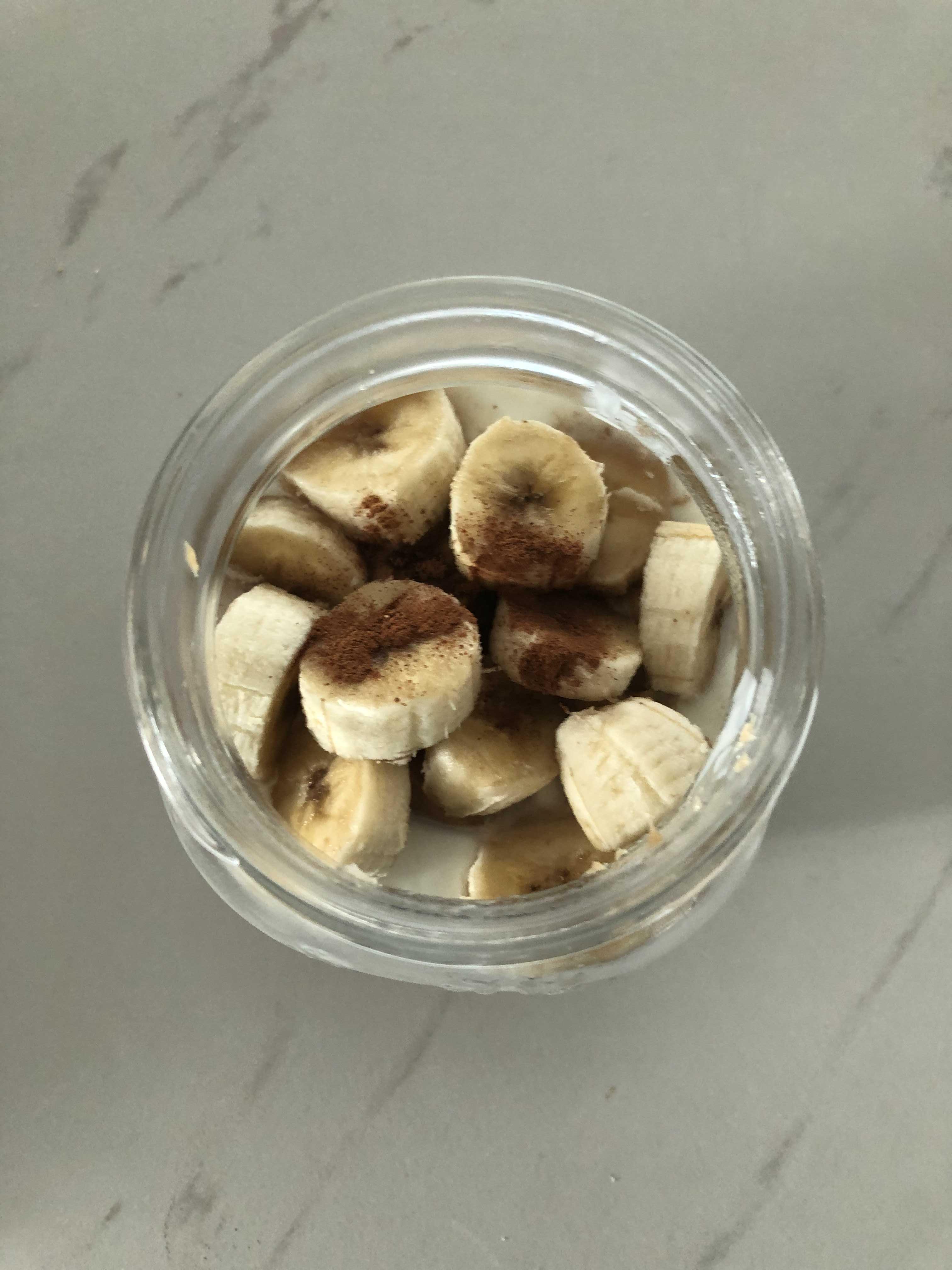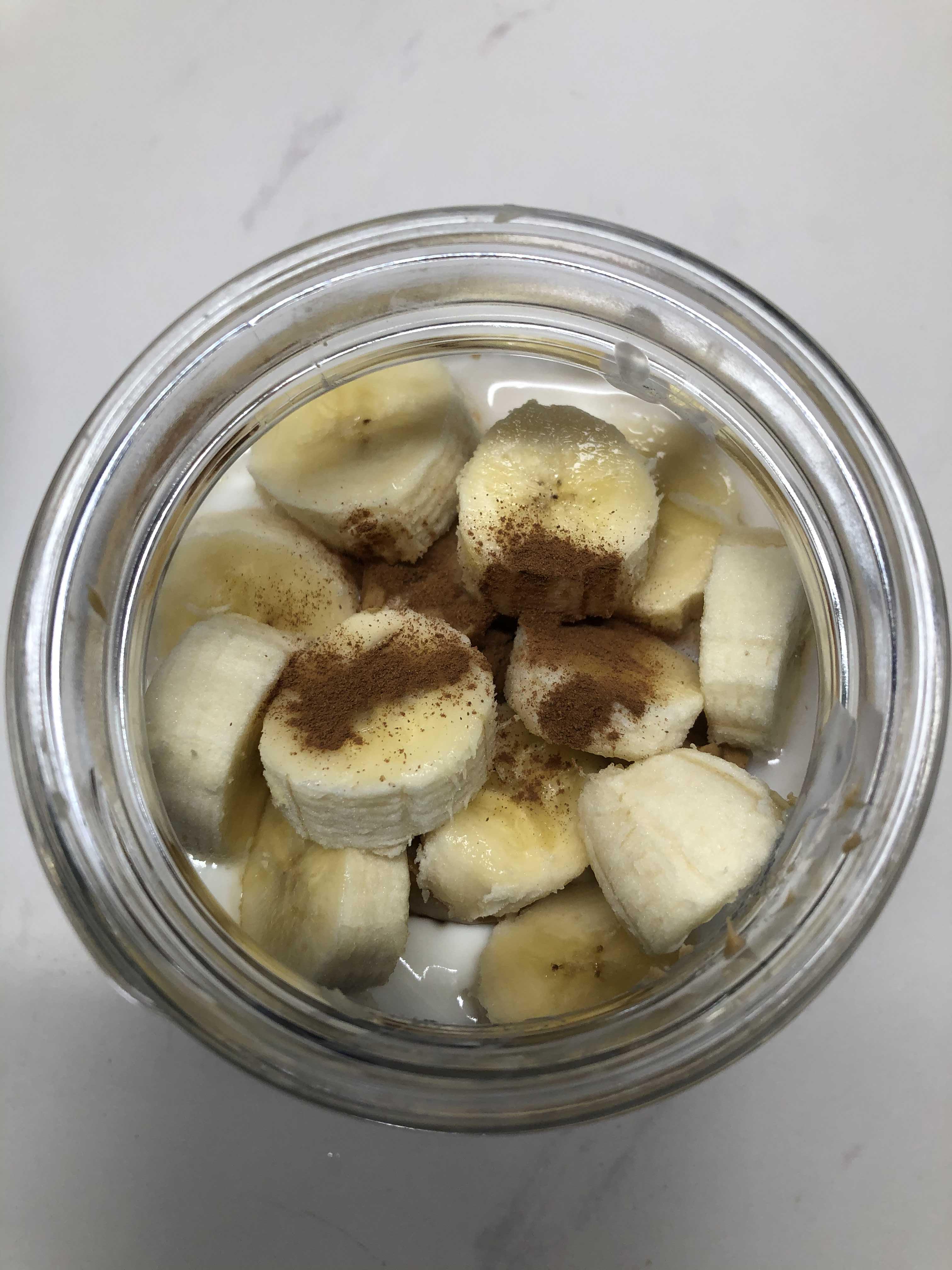 피넛버터를 넣어주고 좋아하는 과일이나 견과류를 넣자. 우리 아이들이 제일 좋아하는 과일인 바나나와 시나몬의 조합으로 했다. 사과나 베리류도 좋다.