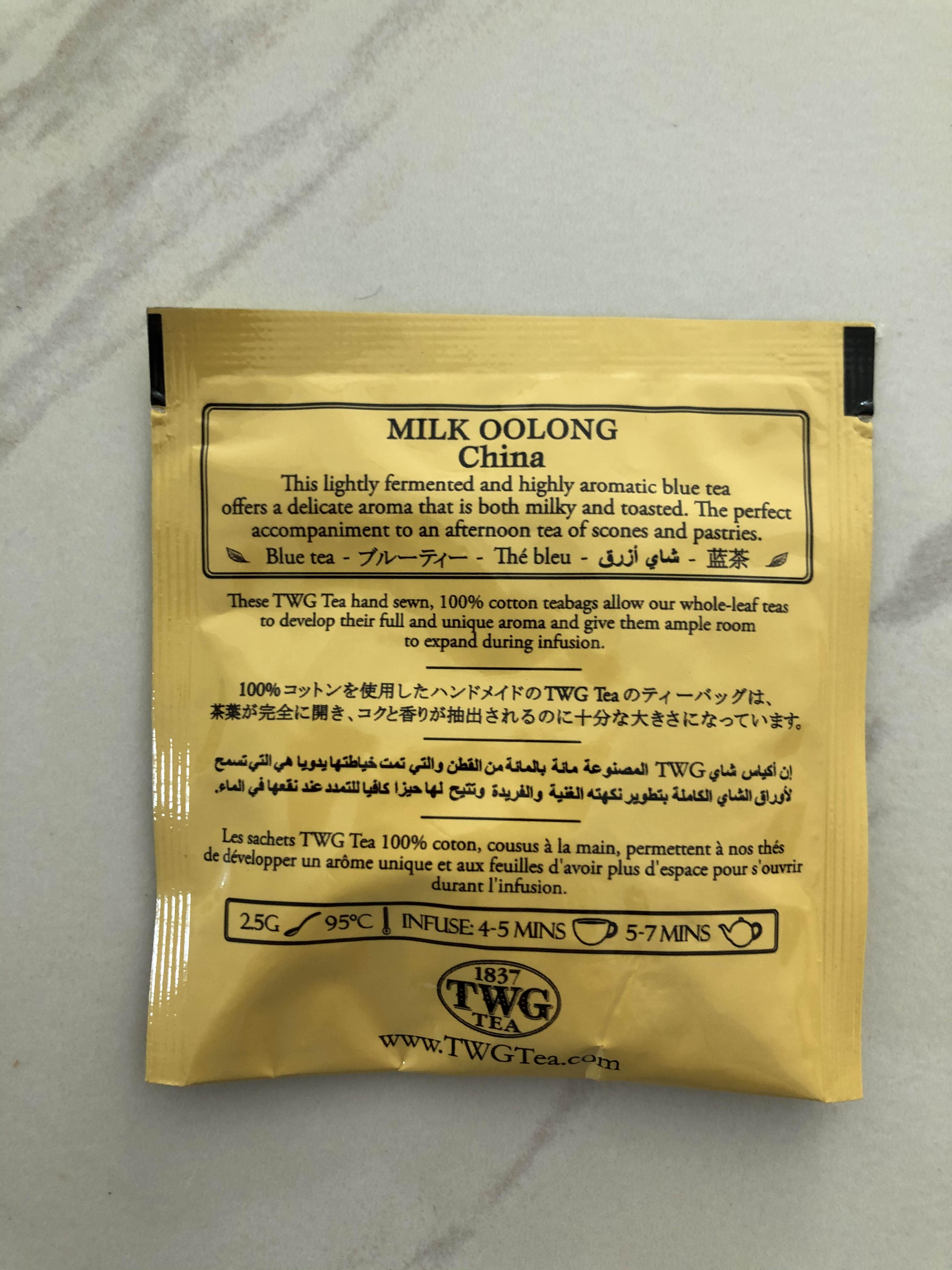 티백 뒷면에는 우유향의 섬세한 아로마를 스콘과 패스트리와 함께 애프터눈 티로 즐기라고 쓰여있다. 우유 향이 간식을 당기게 하는 건가..그러나 오늘의 티푸드는 없다. 그래도 TWG의 밀크 우롱차는 스트레이트로 단독으로 먹어도 훌륭한 차이다.