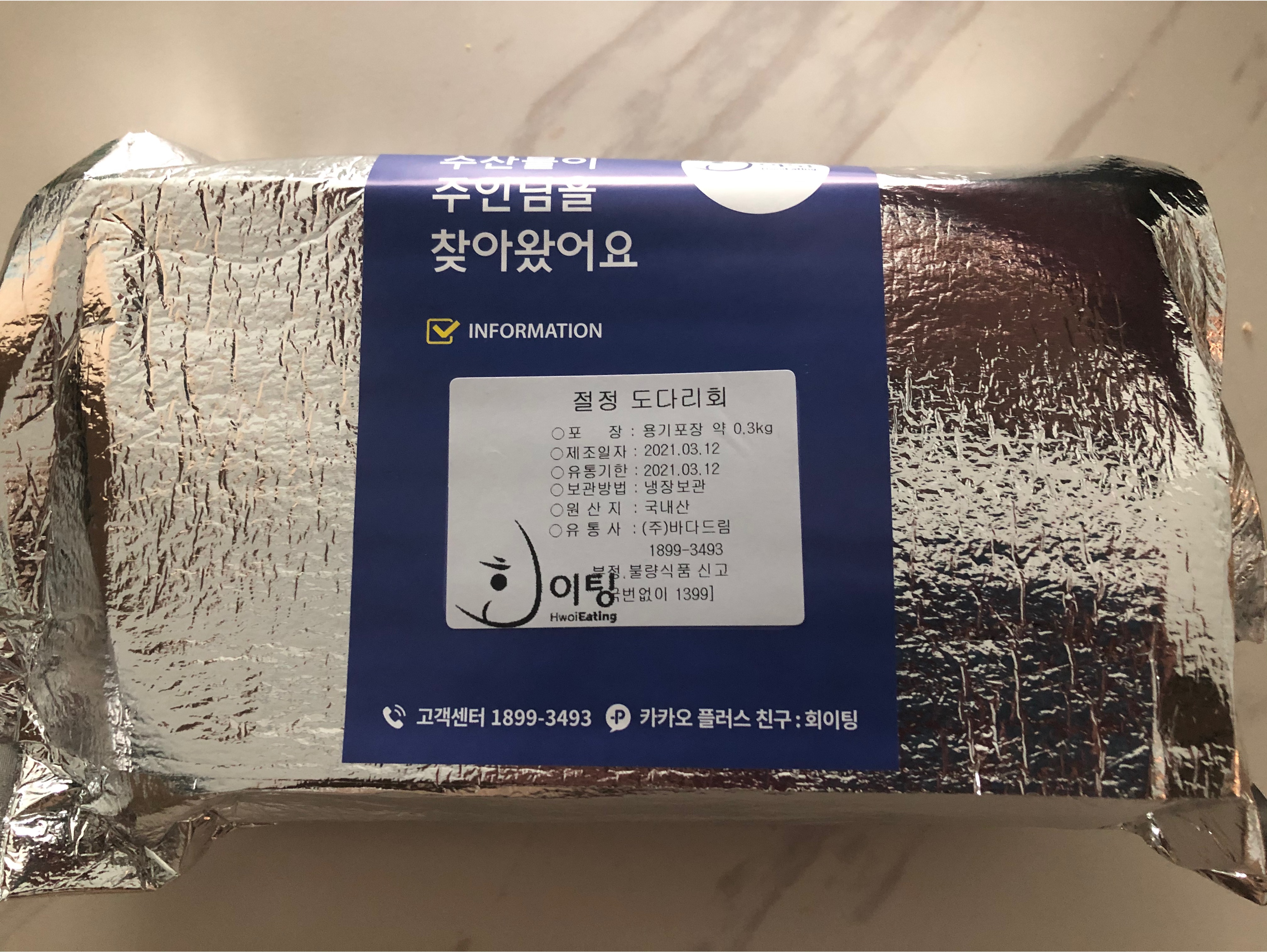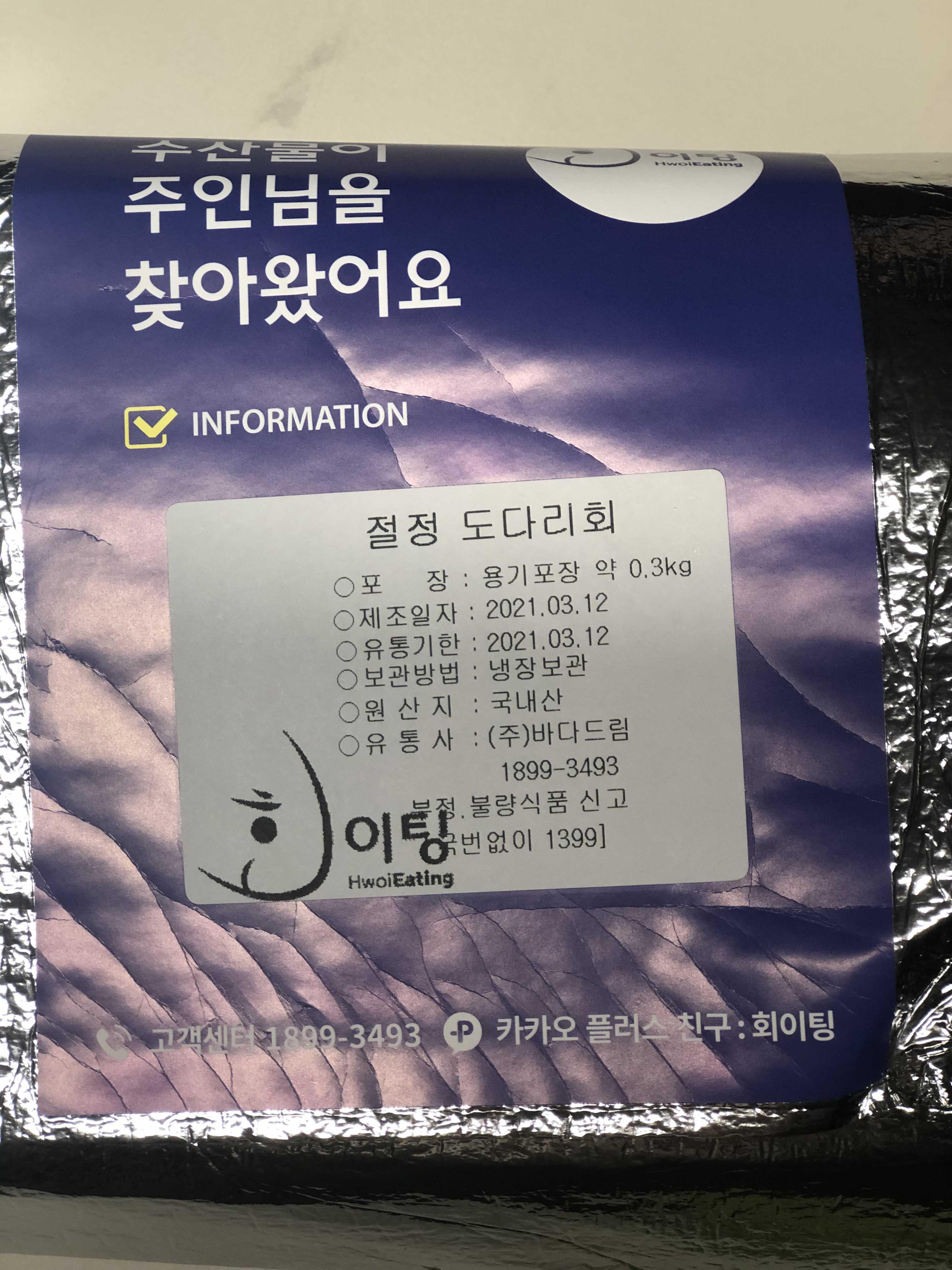 회이팅에서 회를 주문하면 노량진 수산시장에서 직접 퀵으로 보낸다고 한다. 오전에 주문하고 받는 예상시간이 2시에서 6시 사이였는데 2시에 바로 받았다. 주문하고 거의 4시간만에 받은 듯..