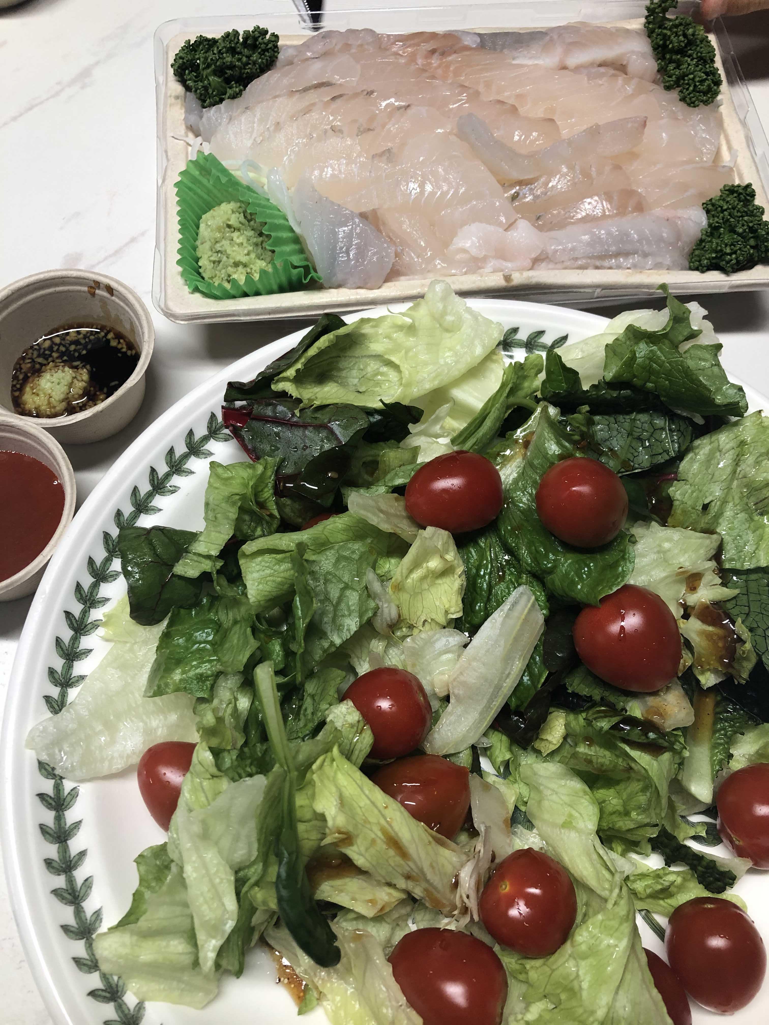 도다리회의 양이 300g인 것을 알고 시켰는데 실제로 보니 정말 적긴 적어서 아쉬웠다. ㅠㅠ 남편의 손바닥 만한 사이즈로 300g이면 남편과 내가 서로 애틋한 마음으로 양보하면서 먹어야 하는 양이다. 아마 대식가에게 회 300g은 딱 1인분의 양이 아닐까? 하지만 쫄깃쫄깃한 도다리의 식감을 잘 살릴 수 있게 도톰하게 회가 떠져와서 그 점은 마음에 들었다.