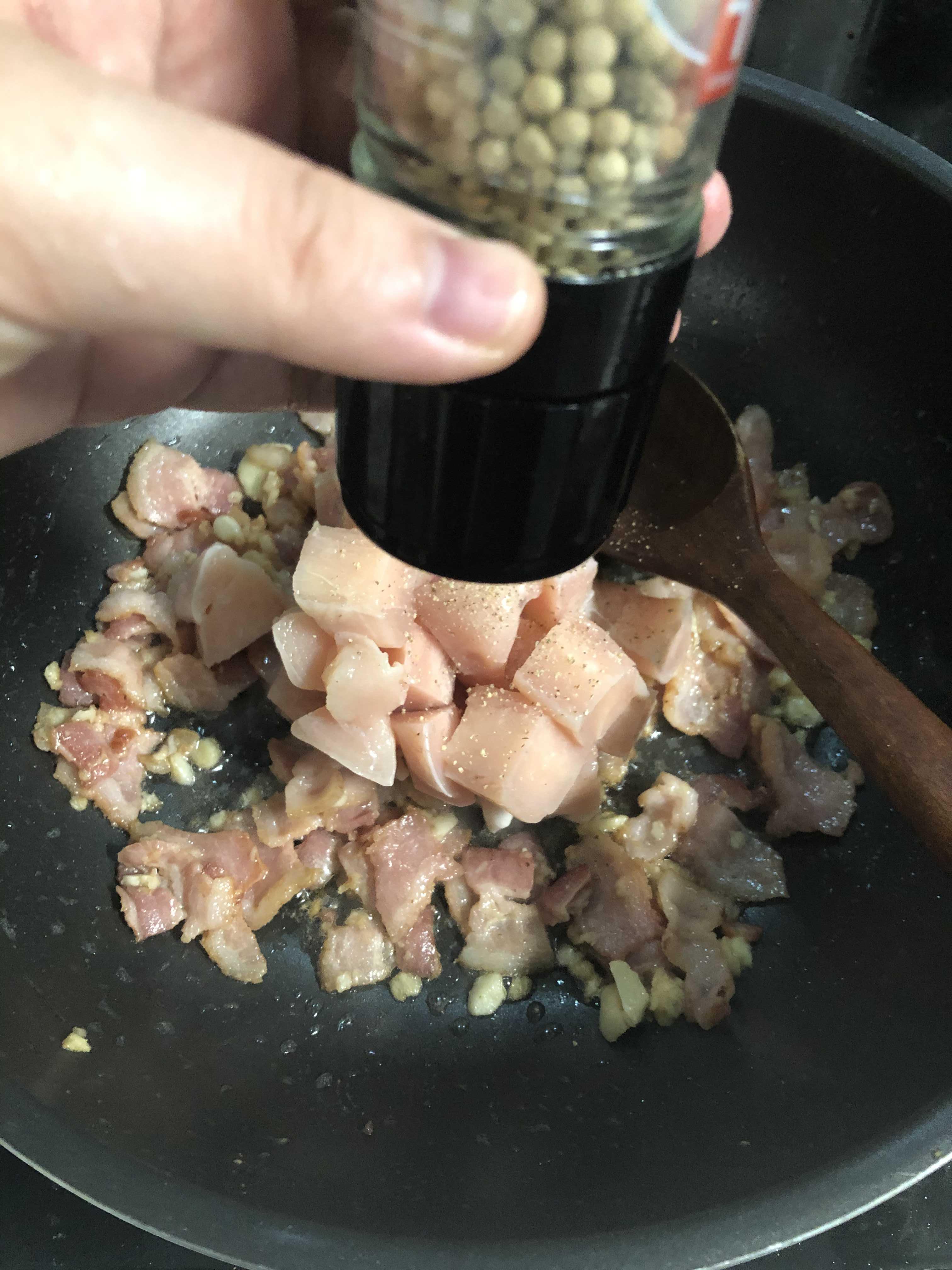 두번째 비법은 흰 후추와 넛맥을 넣는 것이다. 애매할 때 넣지 말고 닭고기 볶을 때쯤 육류의 누린내를 줄여줄 겸 팍팍 뿌리자. 후추와 넛맥의 적당한 양은 너무 취향을 타는 부분이라 얼마나 넣으라고 적기 힘든 것 같다. 후추를 좋아하는 내 경우는 후추는 정말 팍팍.. 너트맥은 1/3 작은술 넣자. 만약에 흰 후추가 있다면 검은 후추보다 흰 후추를 넣는 것을 추천한다. 흰 후추는 매운 맛이 강한 후추의 겉껍질을 벗긴 것이기 때문에 크림소스에는 흰 후추가 맛과 색깔이 튀지 않고 부드럽게 더 잘 어울린다. 너트맥은 생략해도 좋지만 넣으면 크림소스가 훨씬 맛있어진다.