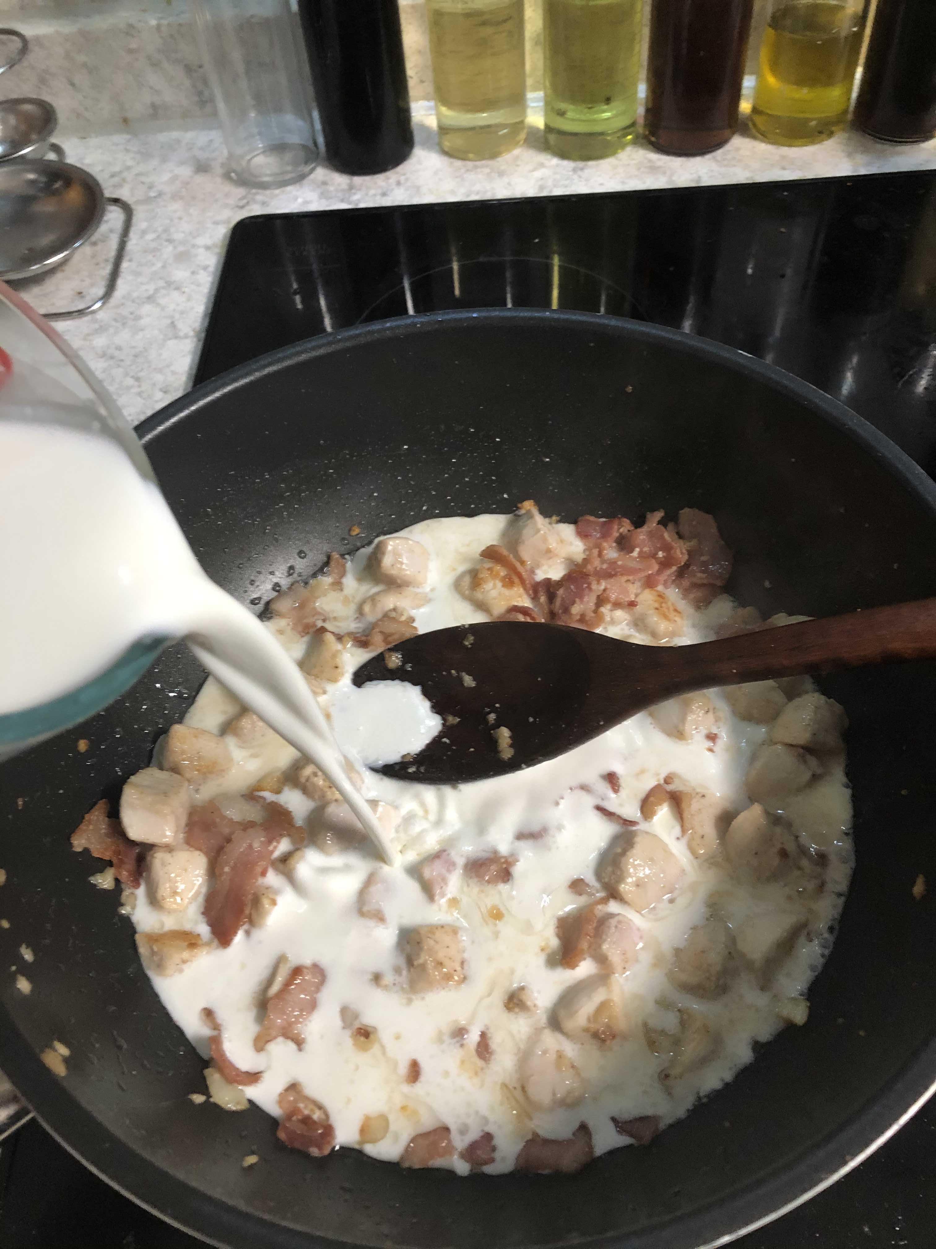 세번째 비법은 생크림을 하나도 넣지 않고 우유만 넣고도 얼마든지 크림소스를 만들 수 있다는 것이다. 크림소스라서 당연히 크림이 들어가야 할 것으로 생각하는 사람들이 많다. 하지만 우유와 밀가루의 조합으로 묽지 않고 적당한 농도의 크림소스를 만들 수 있다. 하지만 이날 나는 생크림이 있어서 생크림을 넣었다 ㅋㅋㅋ (위장이 약한 사람이 아니고서야 기름진 맛을 선호하는건 인간의 본능이라카더라.) 우유만 넣고 충분히 맛있게 먹을 수 있으니 느끼한 것을 싫어하면 우유만 넣고 크림소스를 만들자.