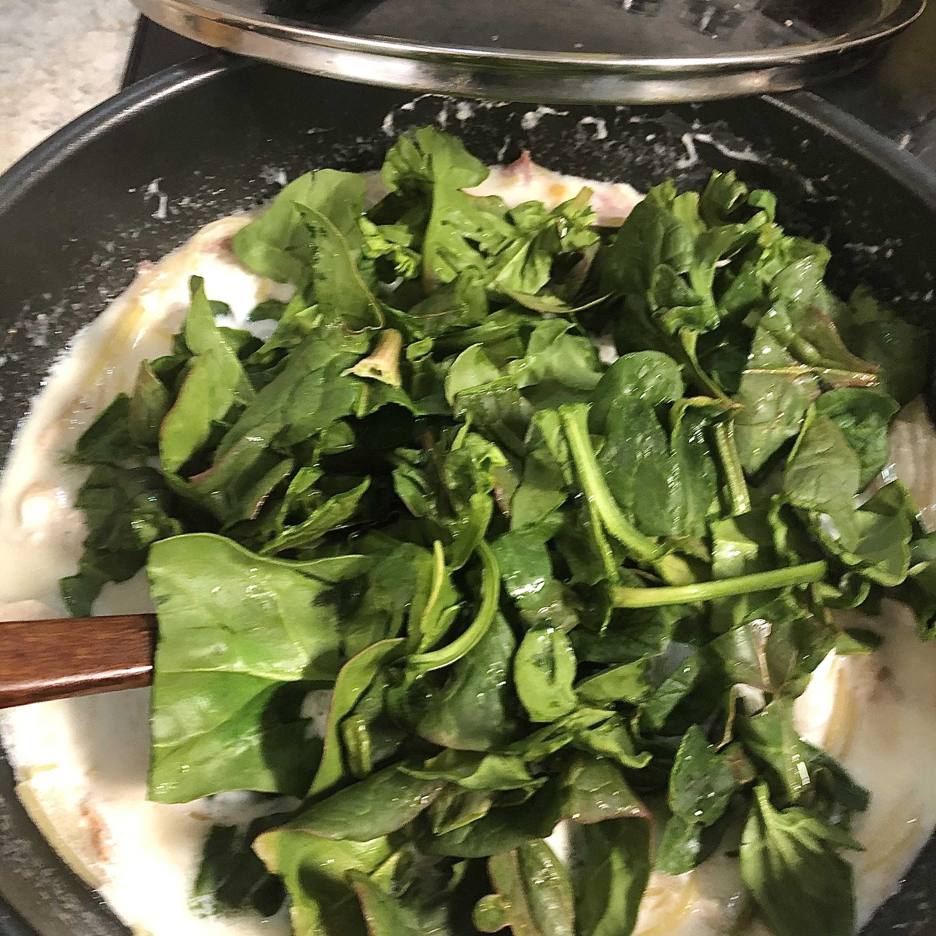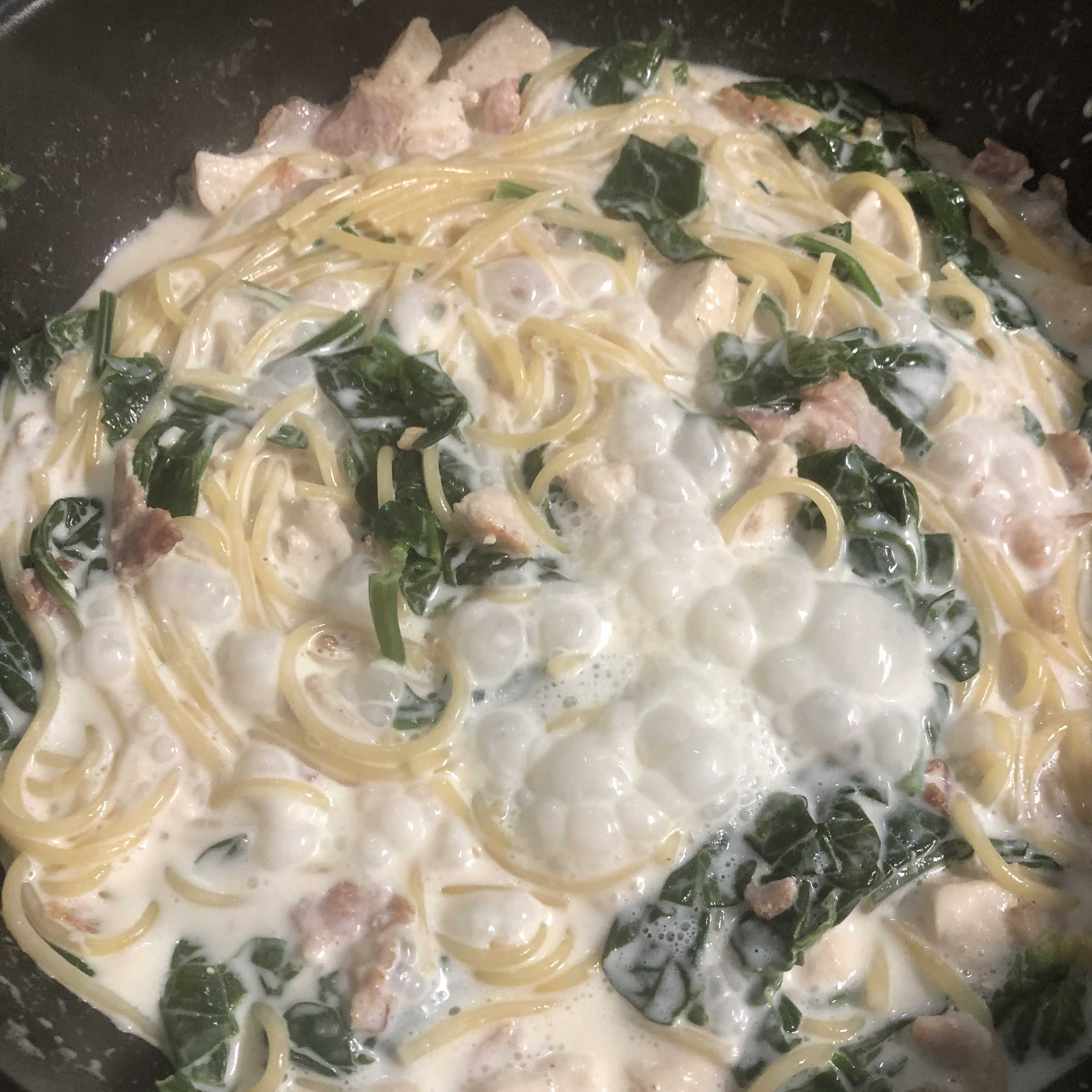 시금치를 스파게티 면이 대략 70프로 정도 익었을 때 팬에 넣어줘야 너무 줄어들지 않고 식감이 좋다. 시간으로 따지면 스파게티 면을 넣고 5분 정도 지난 후일 것 같다. 사람마다 선호하는 식감이 다르지만 나는 아이들 때문에 어쩔 수 없이 되도록 스파게티면을 푹 익혀주고 있다.