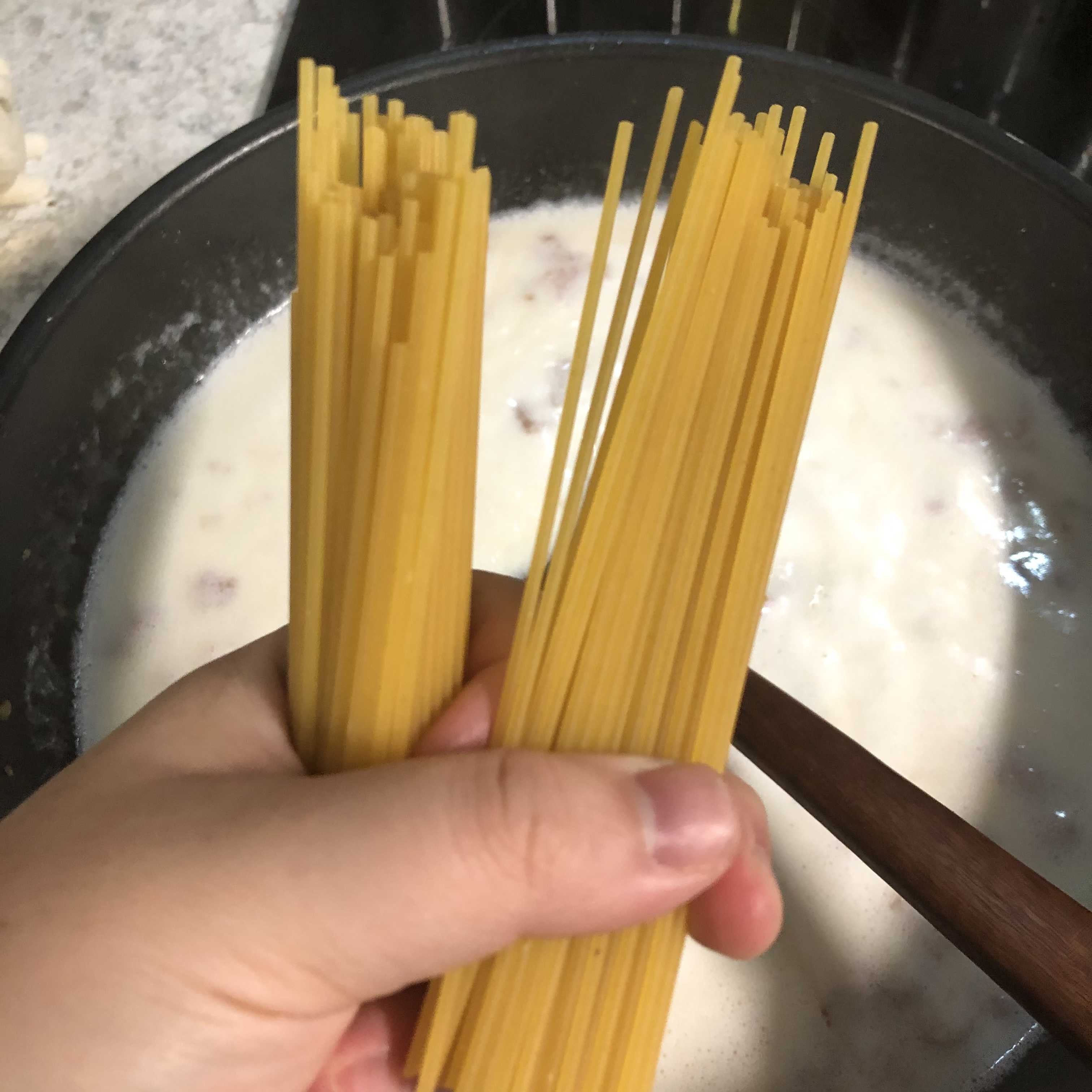 원팬 파스타를 만들 때 파스타면을 통째로 넣으면 스파게티 면 끝자락이 잘 익지 않는 경우가 있다. 내가 주로 사용하는 28cm 웍은 꽤 큰 사이즈인데도 파스타면이 잘 안익기도 한다. 그럴 때는 과감히 파스타면을 반으로 잘라주자. 적당히 집어 양손으로 끝을 잡고 똑 잘라주면 당연히 잘 끊어진다. 면이 짧아져서 식감이 걱정될 수 있겠지만 먹으며 자르지 않은 스파게티면과 다른 점을 전혀 느끼지 못했다.