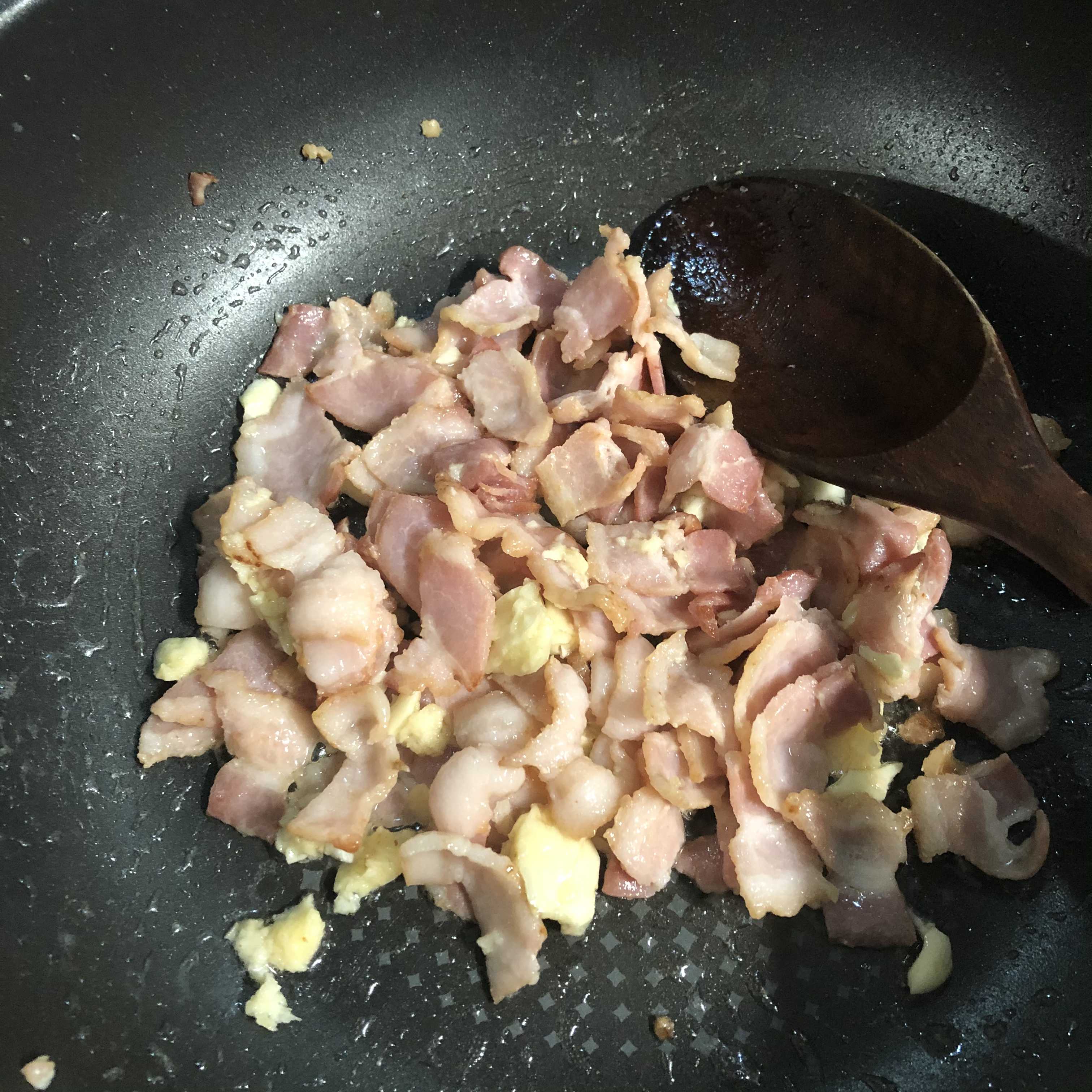 느끼하지 않게 크림소스를 만드는 방법의 첫번째 비법은 마늘이다. 어떤 크림 스파게티 레시피에는 양파를 넣는 경우가 있는데 개인적인 입맛으로는 비추한다. 크림소스는 감칠맛으로 먹는건데 양파를 넣으면 양파의 단맛이 우려나온다. 다시 말해 이도 저도 아닌 맛이 되기 싶상이니 꼭 감칠맛을 살려주는 마늘만 넣으시라. 나는 다진마늘을 듬뿍 떠서 2큰술 넣었다. 취향에 따라 1큰술을 넣어도 될 것 같다. 베이컨을 먼저 중불에 볶아주며 기름이 살짝 나왔을 때부터 마늘을 약불에 타지 않도록 볶아주자.