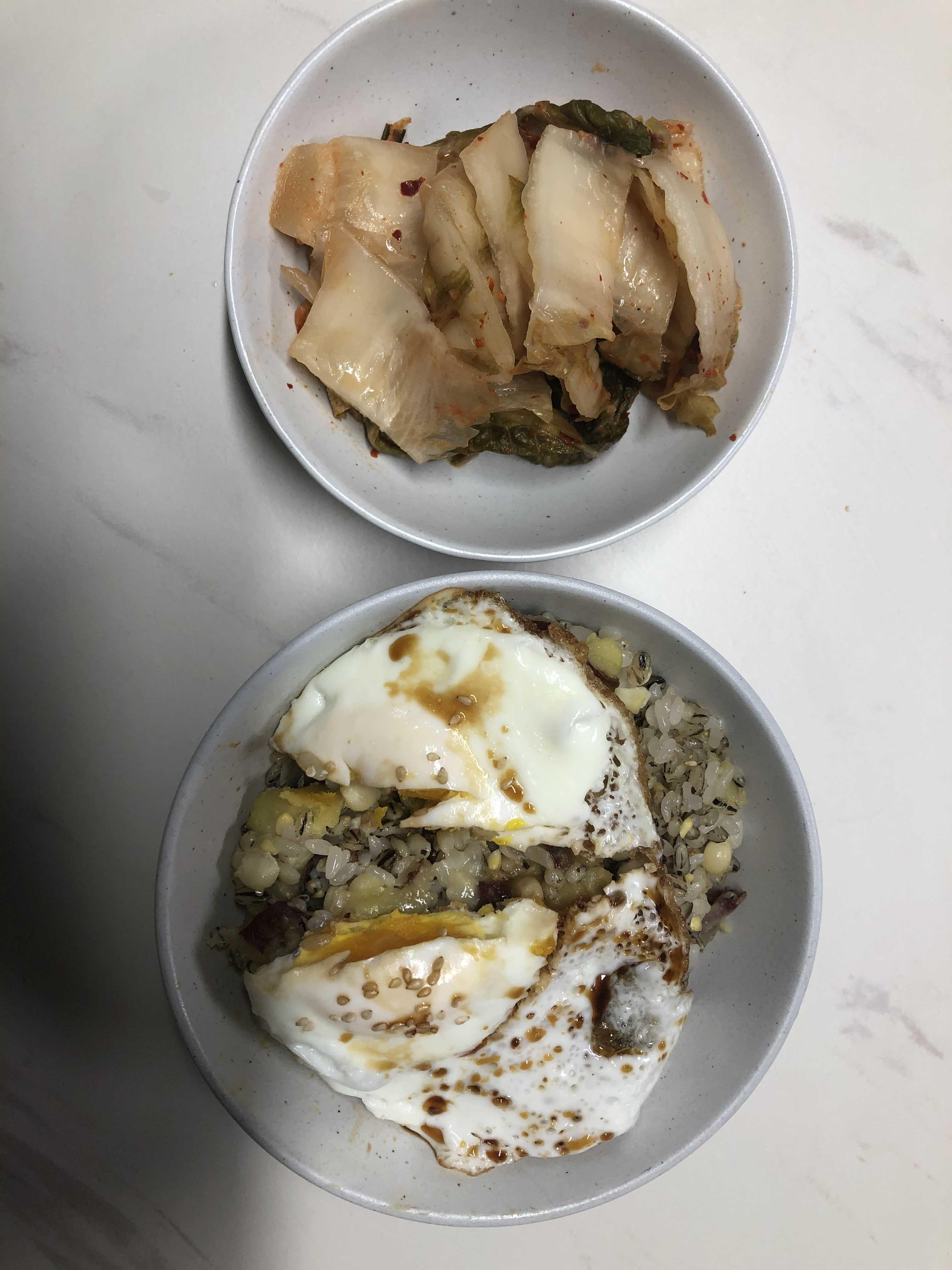 나는 먼저 건져낸 어여쁜 반숙 후라이. 여기에 버터를 약간 넣고 간장 밥숟가락으로 하나 넣고 쓱쓱쓱 비벼서 신김치와 먹으면 한그릇이 순식간에 없어진다. 고구마와 신김치의 환상의 케미는 진리다. 거기에 톡톡 터지는 옥수수알과 보리쌀의 콜라보레이션은 덤^^ 최고의 요리비결 덕분에 원래 해먹던 고구마밥보다 업그레이드 되어 간편하고 맛있는 식사를 할 수 있었다.