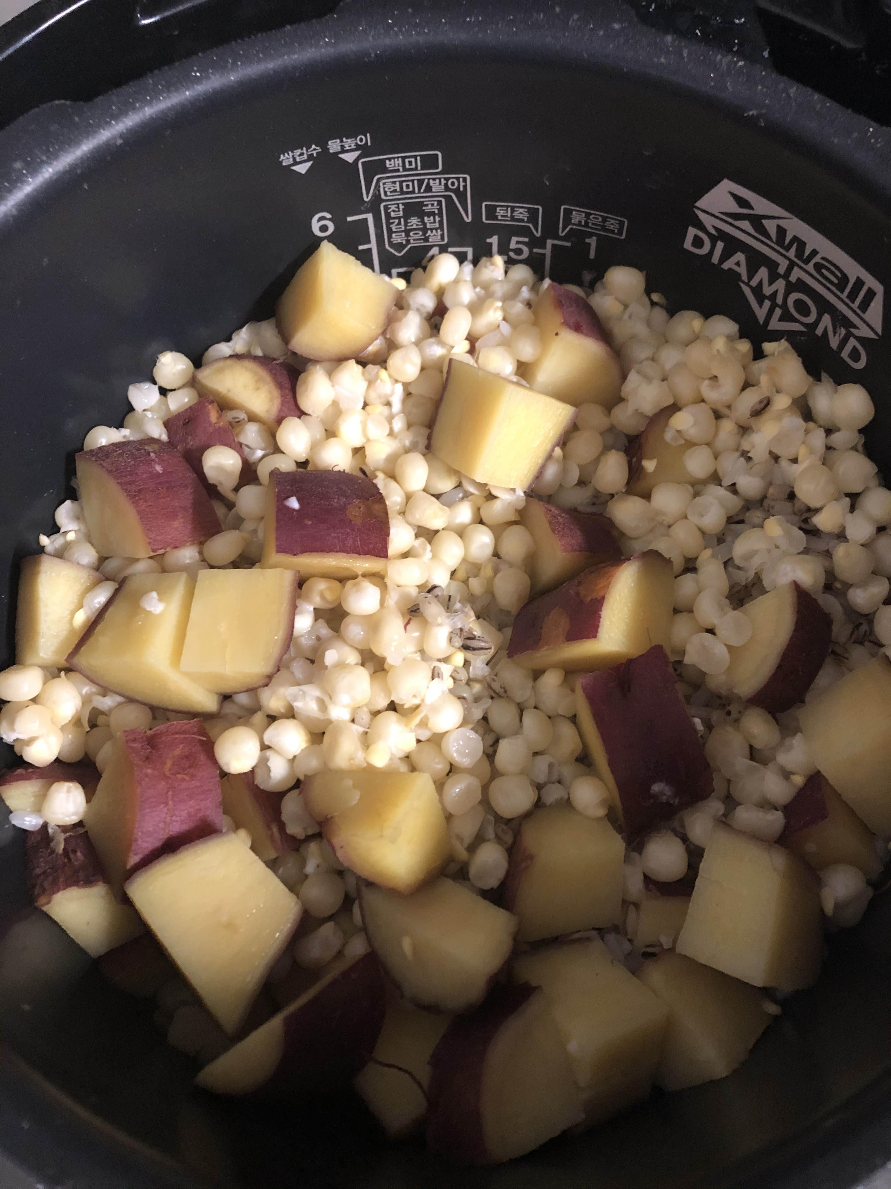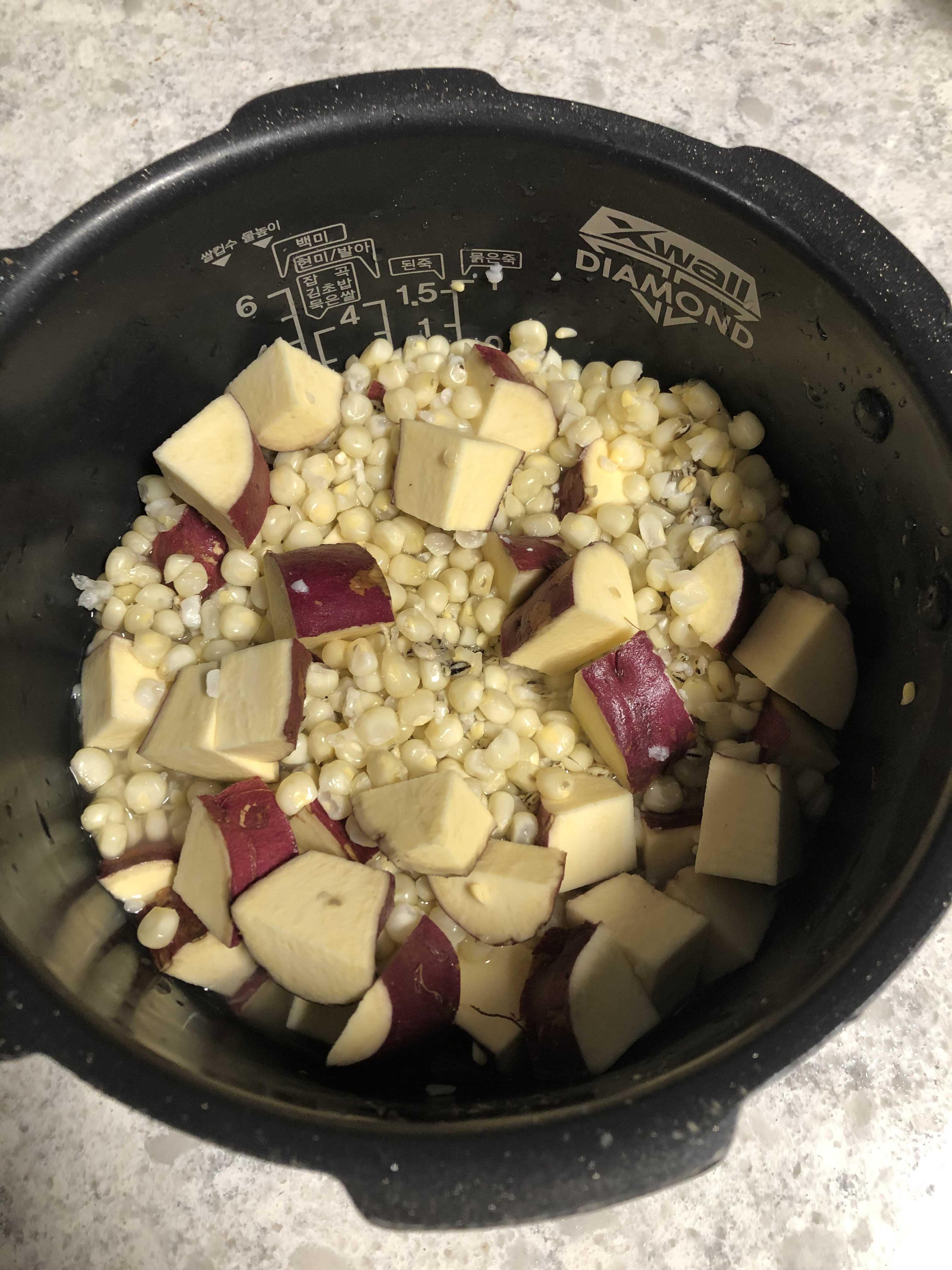 불린쌀 1컵, 검정보리쌀 반컵, 찰옥수수 1개, 밤고구마 중간크기로 2개, 물 1컵반